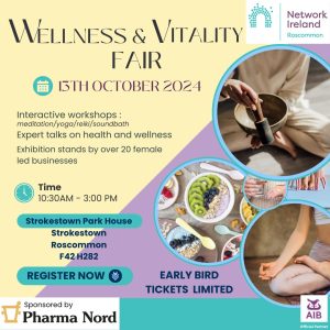 ![]() Join Network Ireland Roscommon for their 'Wellness & Vitality Fair' here in Strokestown Park on October 13th starting at 10.30am until 3pm. There will be interactive workshops, expert talks on health and wellness as well as 20 exhibition stands by female led businesses. For further information and to register for this event click here. |